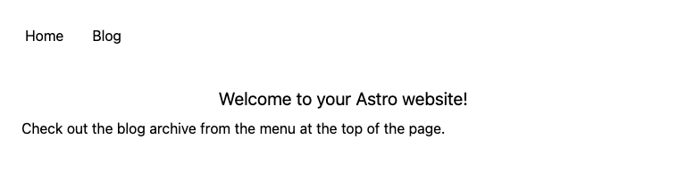 --- import BaseLayout from '../layouts/BaseLayout.astro'; --- <BaseLayout title="Welcome to your Astro website!"> <p>Check out the blog archive from the menu at the top of the page.</p> </BaseLayout>